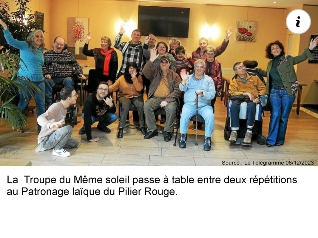 La troupe Le même soleil, de l’APF France handicap, répète toutes les semaines au patronage laïque du Pilier-Rouge la pièce « Un autre regard au bout de la Terre », sur la thématique du handicap. Le spectacle sera joué au printemps au patronage laïque. La troupe est encadrée par Monica Campo et Fabiola Nicoli.